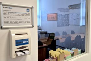 Die Ideen könnt ihr einfach schriftlich in die Ideenbox einwerfen. Diese hängt in der Geschäftsstelle und wird regelmäßig geleert. Eure Beiträge werden in der nächsten Verwaltungssitzung besprochen.
