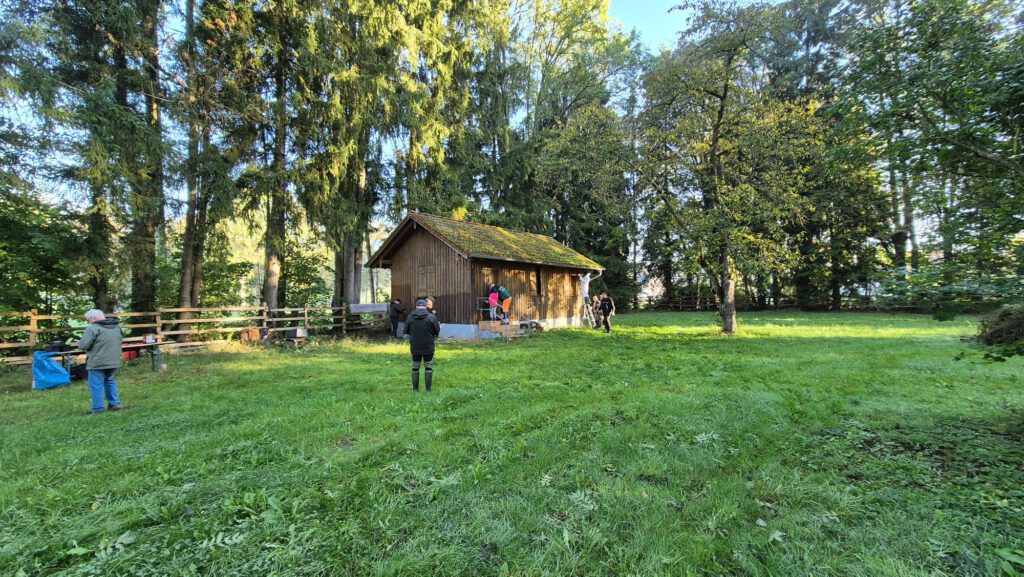 Kurz vor 8h morgens, Nebelschwaden hüllte die Landschaft und unser Grundstück noch vollkommen ein. Zwischen den Bäumen bahnen sich die ersten goldene Lichtstrahlen der aufgehenden Sonne ihren Weg und kündigen einen wunderschönen sonnigen Tag an. 17 Mitglieder sind der Einladung zum Arbeitsdienst am Grundstück in Schwarzhofen gefolgt.