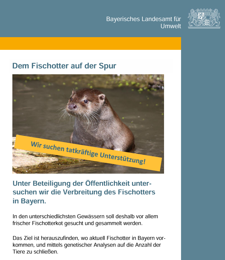 im Rahmen des durchgeführten Fischotter-Monitorings startet im Herbst ein Projekt mit Öffentlichkeitsbeteiligung. Ziel ist es auf breiter Datengrundlage zu erfassen, wo und wie viele Fischotter in Bayern leben. Hierfür sind ehrenamtliche Helfer für die bayernweite Erhebung gefragt. Über Unterstützung würden wir uns sehr freuen!
