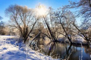 An einem kalten Wintertag sitzt ein Angler mit dicken Backen am See.